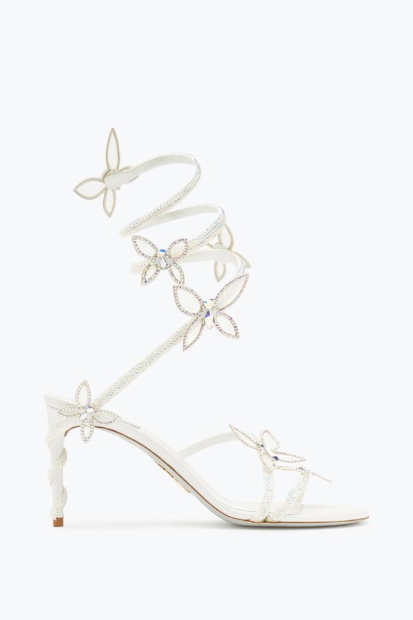 The latest iteration of the iconic Margot sandal is an ode to femininity. Dainty crystal-encrusted tulle butterflies are delicately perched on the snake-printed straps, from the signature snake element coiled around the heel and ankle to the two asymmetrical toe bands. The signature silver-dusted sole adds the finishing touch.– Made in Italy– Heel height 3,1– Almond toe– Satin and leather– Leather sole