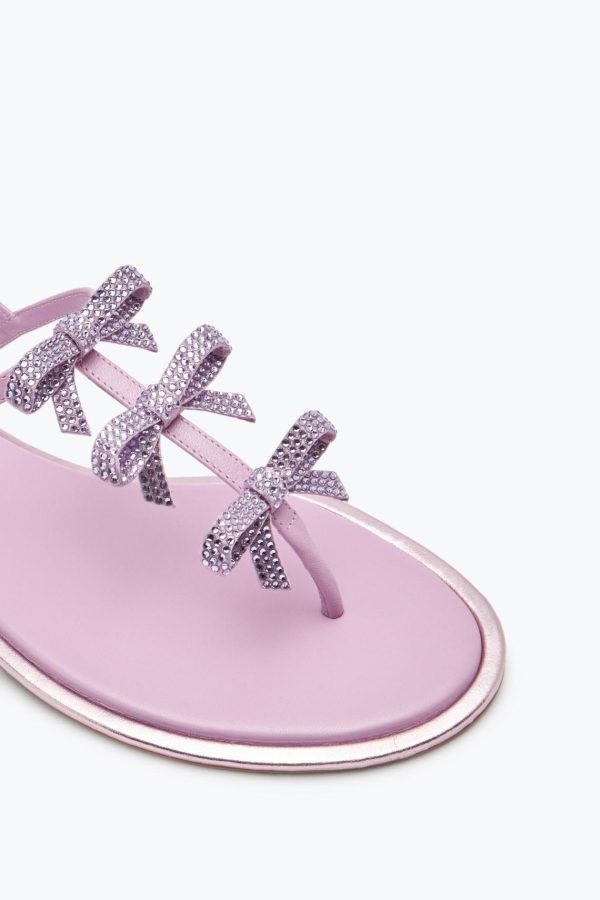The fresh and spring-like mauve nuance gives the Caterina thong sandal uniqueness and grace. The sparkle of the hand applied tone-on-tone crystals on the three small bows is enhanced by the metallic effect of the outer sole, making every step stand out.
