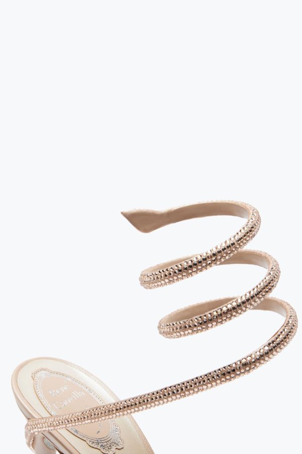 In a pretty neutral color, the Margot platform sandal makes a statement with refined boldness. Its chunky silhouette is softened by the slim heel, the crystal-encrusted snake wrapped around the heel and ankle, and two asymmetrical toe bands. The silver signature-star-dusted sole adds extra sparkle.– Made in Italy– Heel height 5,1– Round toe– Satin– Leather sole