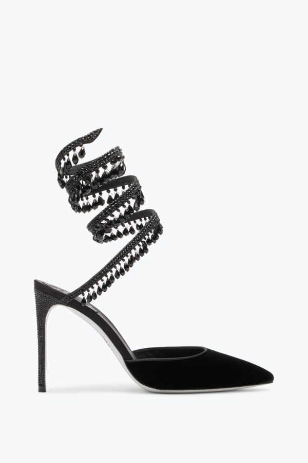 The velvet pumps CHANDELIER are an exclusive model, characterised by an original design and seductive attitude. These black slingbacks feature a velvet front, the iconic snake spiral decorated with matching rhinestones and dangling crystals, plus a high stiletto heel covered with crystals. The refined style of this shoe is completed by the silver stardust sole that provides a sparkling look.