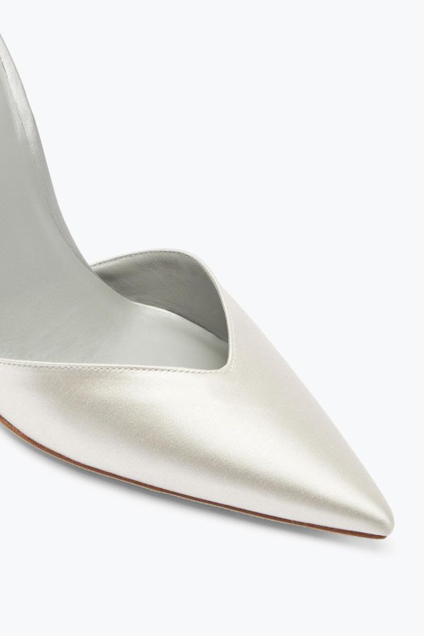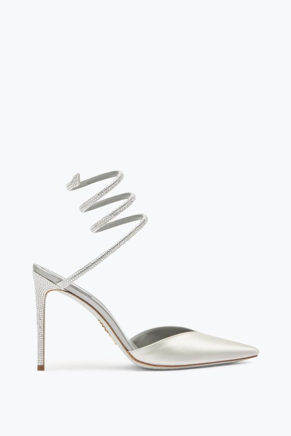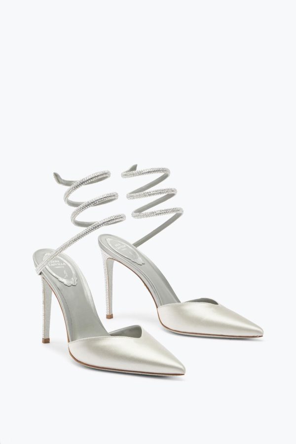 The Cleo open-back pump in silver elevates any day look and dazzles at night. An evolution of a classic pointed-toe design, the coiled snake adds an iconic twist to a forever staple. Matching crystals adorn the stiletto heel. Set on our signature silver-dusted sole, it is entirely hand-made in Italy.– Heel height 4,1– Pointed toe – Satin and nappa– Leather sole