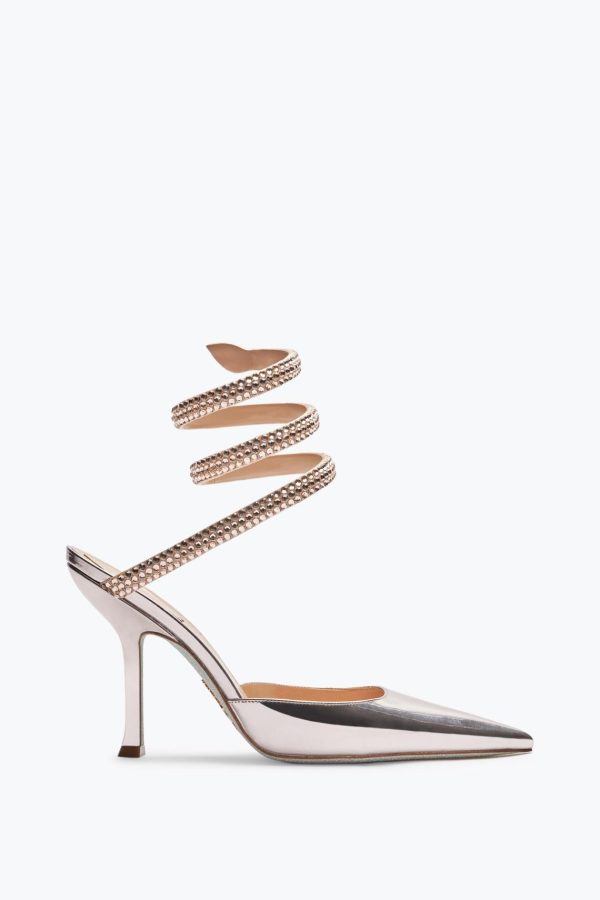 The Cleo pump adds a sensual and sophisticated allure to evening looks. The classic pointed design is sublimated by the mirrored effect of the leather, in a delicate pink, while the iconic serpent is embellished with hand-applied crystals, in a maxi size for that extra dose of sparkle.