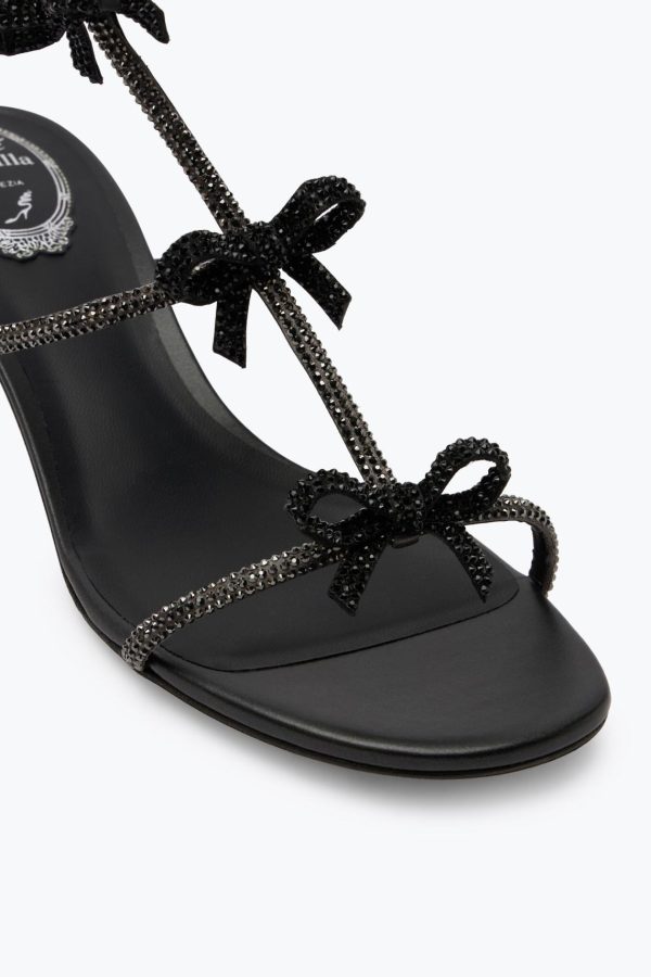 Adorned with three dainty signature ribbons, the black Caterina sandal features a T-bar design, sprinkled with jet tonal crystals that elevate its graceful and timeless charm. A mid-height block heel and classic color make it a versatile wear-forever staple. Handmade in Italy, wear them from sunup to nightfall.
