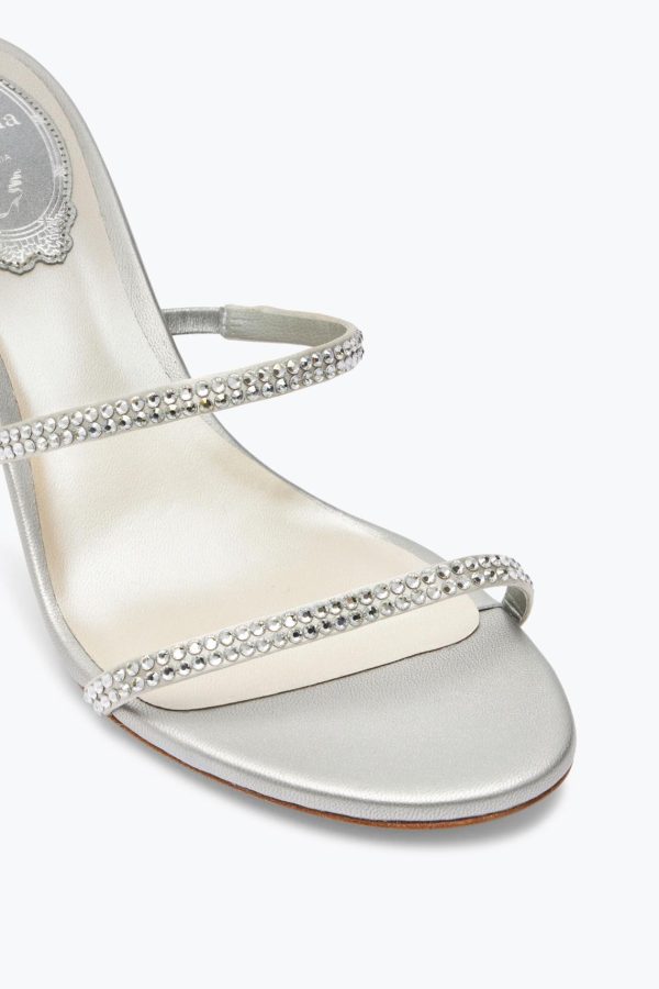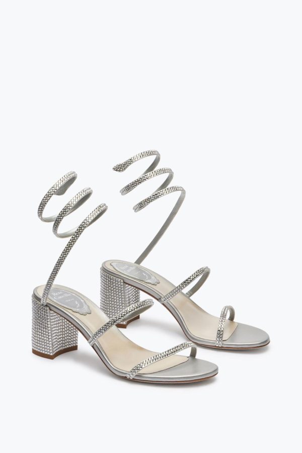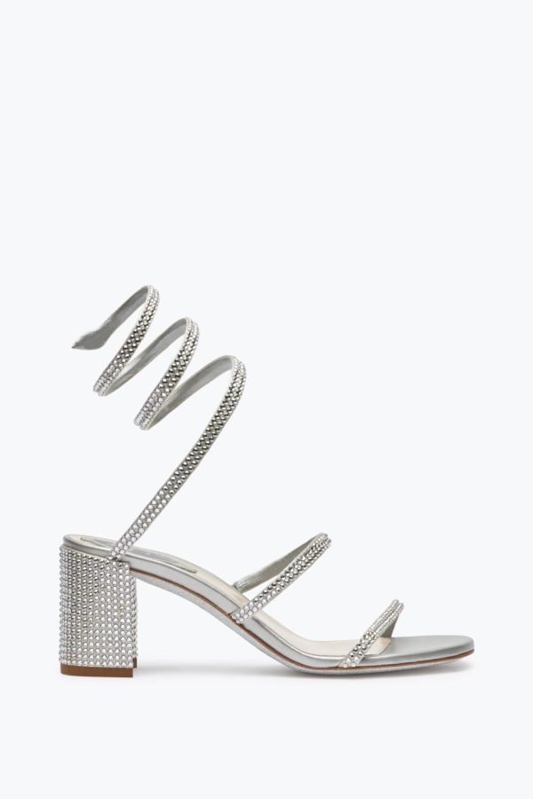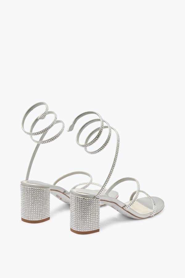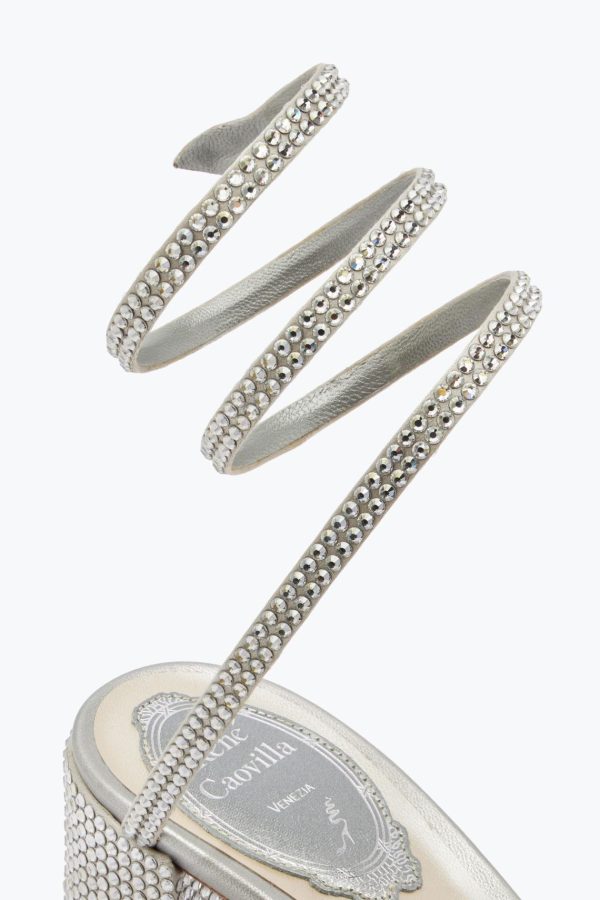 Made in Italy design meets brightness in these silver jewelled sandals CLEO. Its elegant spiral wraps the ankle in a sparkling game that culminates in the double straps and the wide heel, which is completely covered a seductive cascade of precious rhinestones. Satin sandals are perfect for giving a touch of elegance and brilliance to your most sophisticated looks destined for a gala evening.