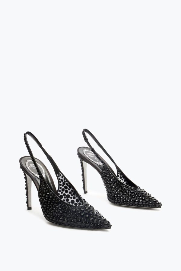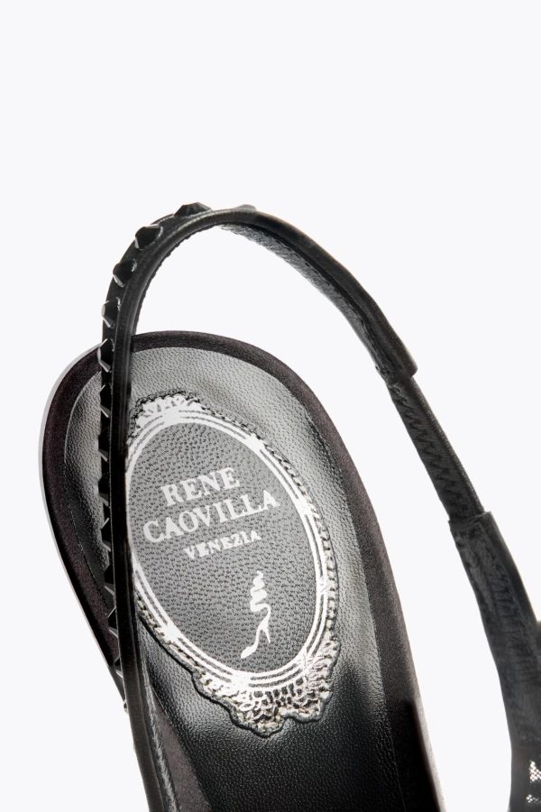 A glam-rock attitude and the unmistakable sparkle of René Caovilla come together in the Gilda slingback. Studded with 1,220 dégradé black crystals that cover it completely, including the high stiletto heel, with a pointed design with a deep neckline and stardust sole, it is the perfect ally for seasonal parties.